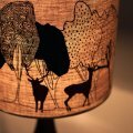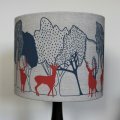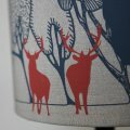 Stylish linen lampshade made in the UK with a screen printed design featuring red stags. Created by artists Orwell and Goode this "Charcoal Day" lampshade is a beautiful creation which deftly combines contemporary illustration with traditional printing techniques. It uses Scottish linen which is hand-rolled to create a drum lampshade with a luxurious finish. The quality of the fabric makes the illustration sing, and the red stags add a fun pop of colour.