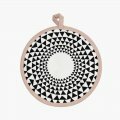 Oven mitts made using organic cotton, with geometric print and coloured trim. These pot holders will keep you from burning your hands when taking something out of the oven and you can even use them as trivets or coasters. The geometric monochrome print is beautifully set off by the coloured trim. These pretty kitchen accessories have a contemporary feel and modern Scandi style. The potholders come as a set, containing two individual oven mitts. They are made of 100% organic cotton and filled with polyester padding.